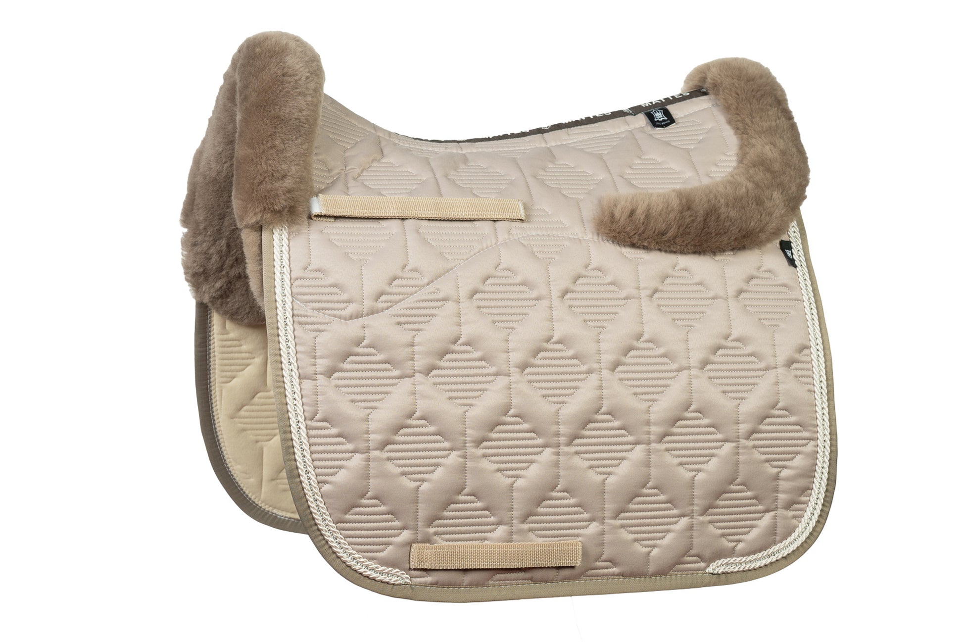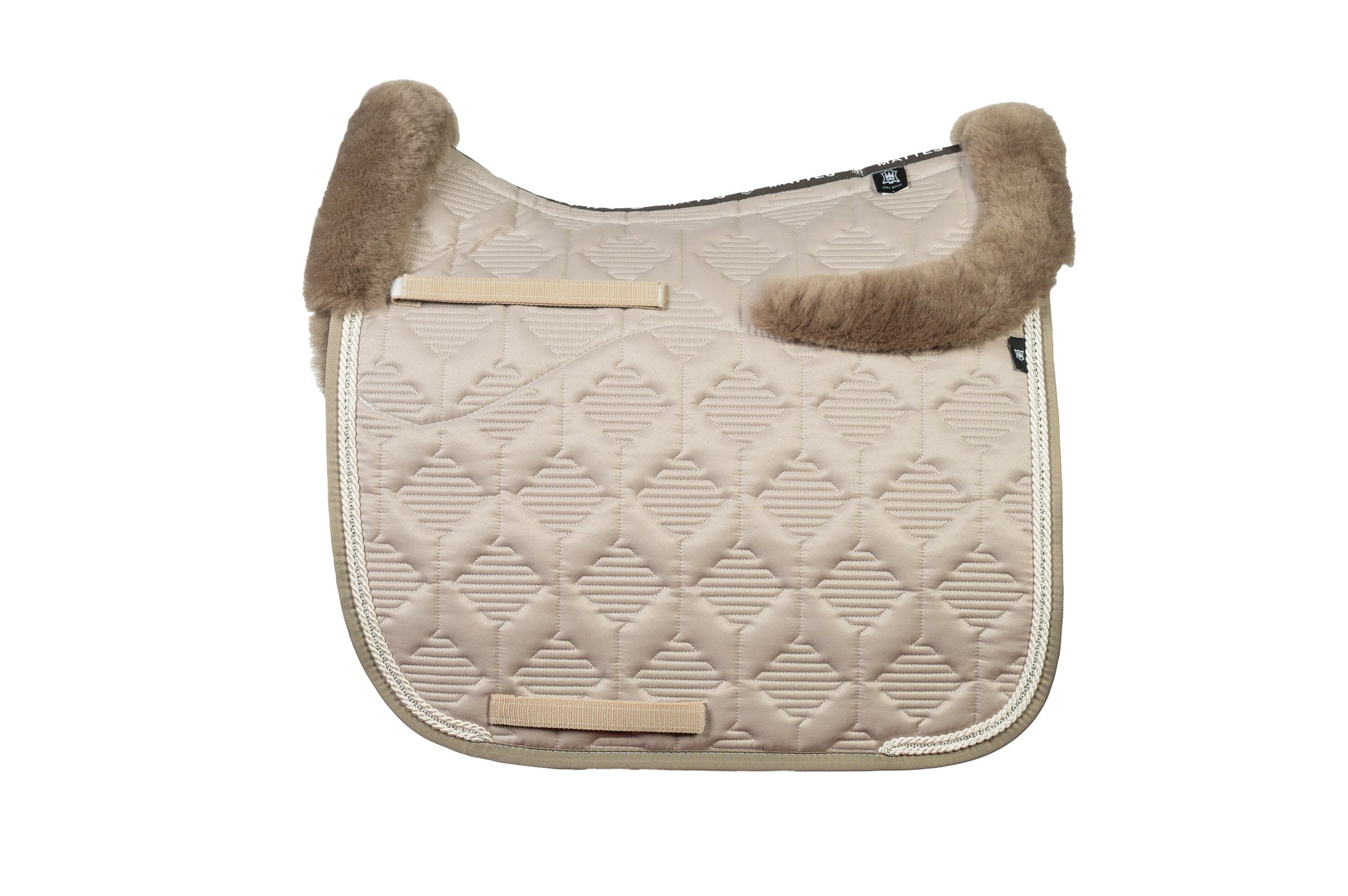 Mattes Schabracke, Dressur Gr. L, Walnuss/Cappucchino mit 2 Kordeln und Crystal Kordel, Lammfellrand vorne und hinten