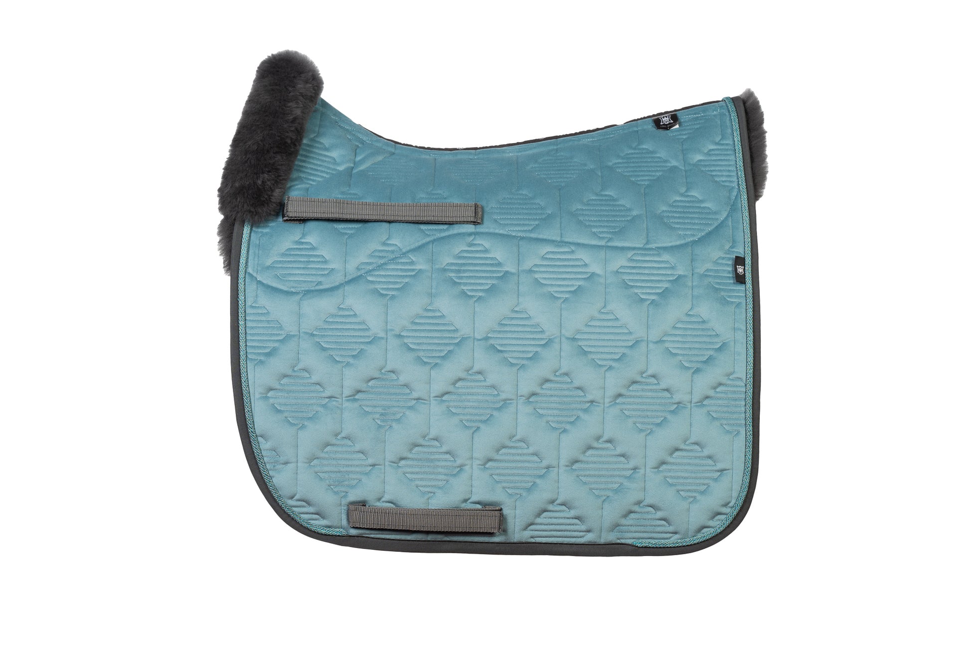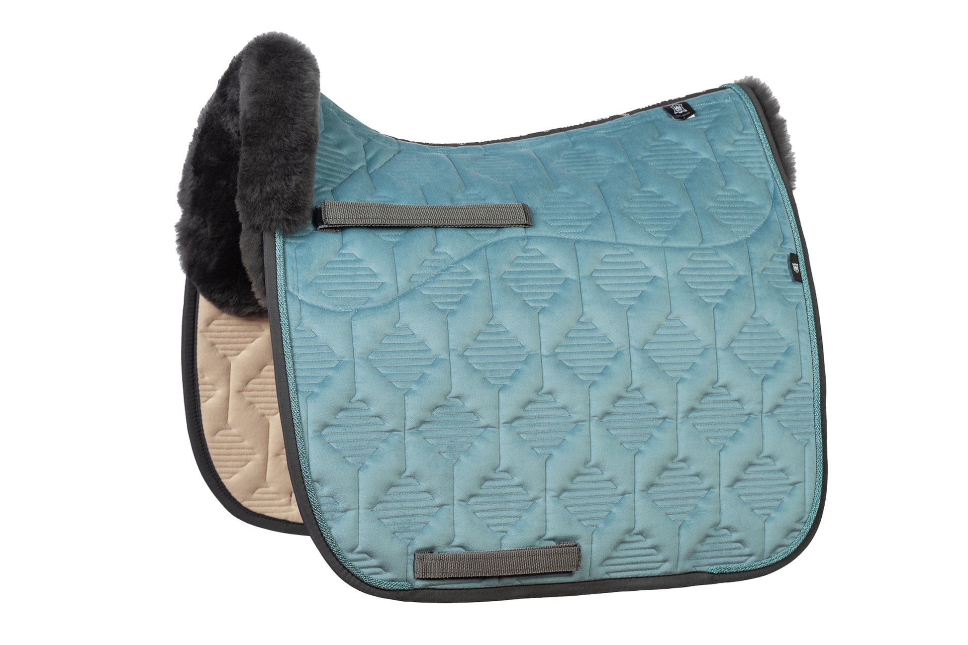 Mattes Schabracke, Dressur Gr. L, Ocean/Graphit mit Webkordel und Lammfellrand vorne und Kissen in der Sattellage