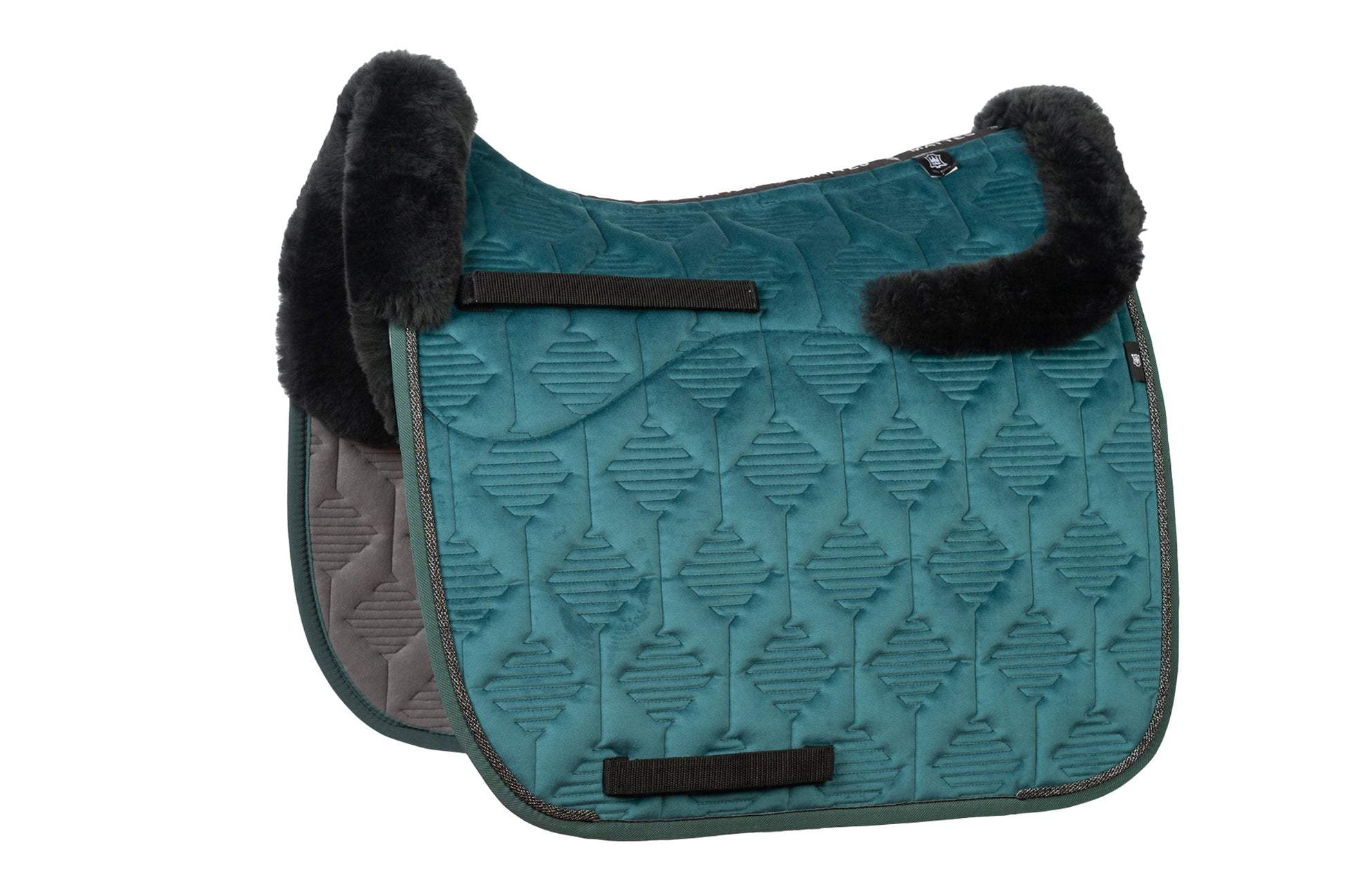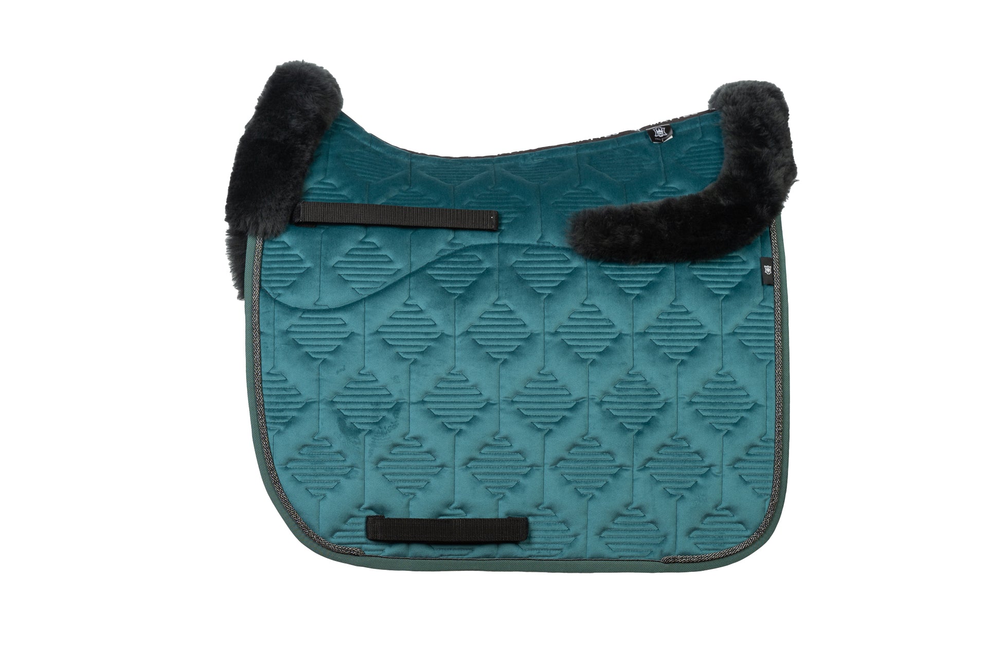 Mattes Schabracke, Dressur Gr. L, Petrol/Cumbrian mit Webkordel und Lammfellrand vorne und hinten