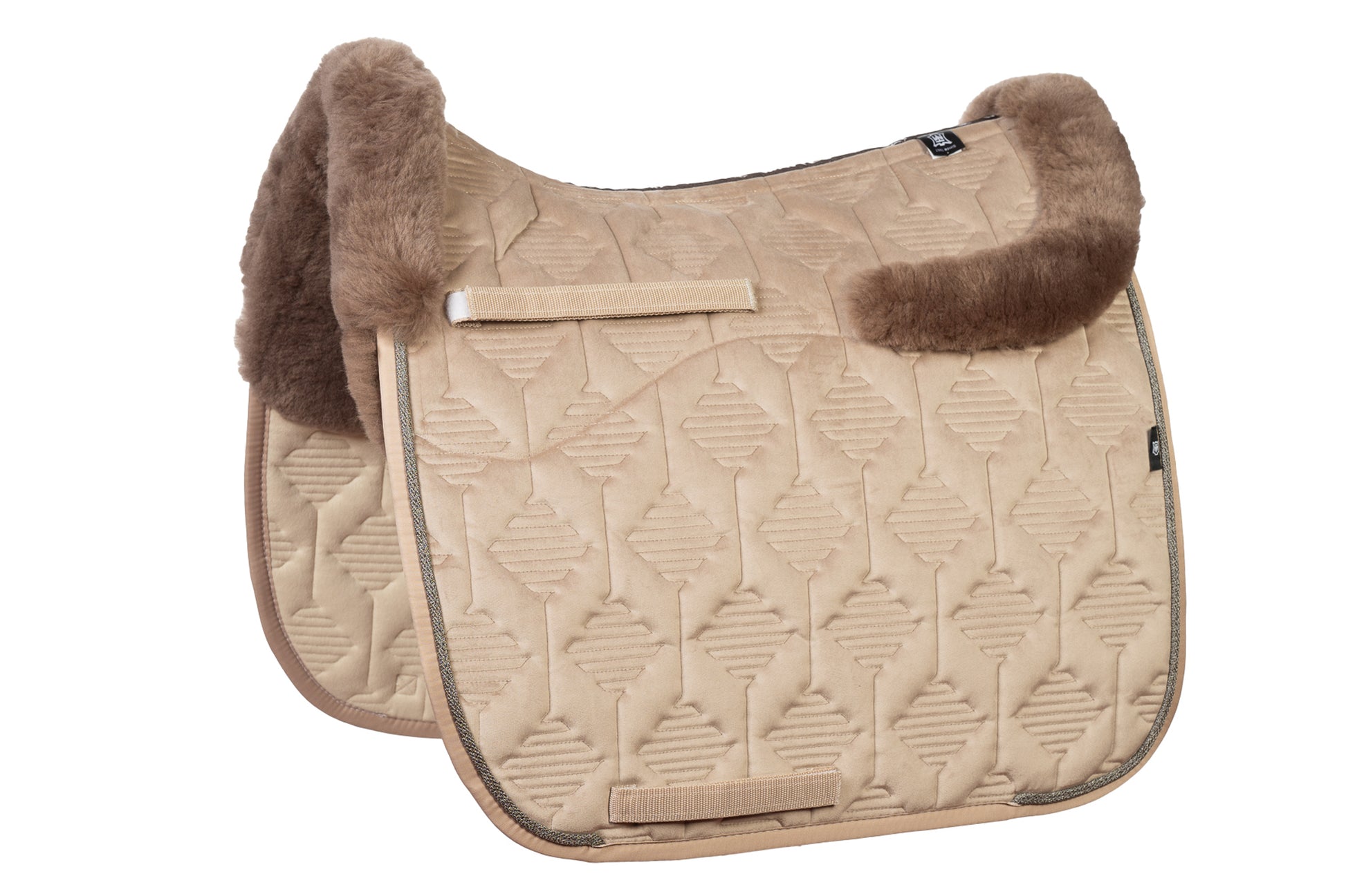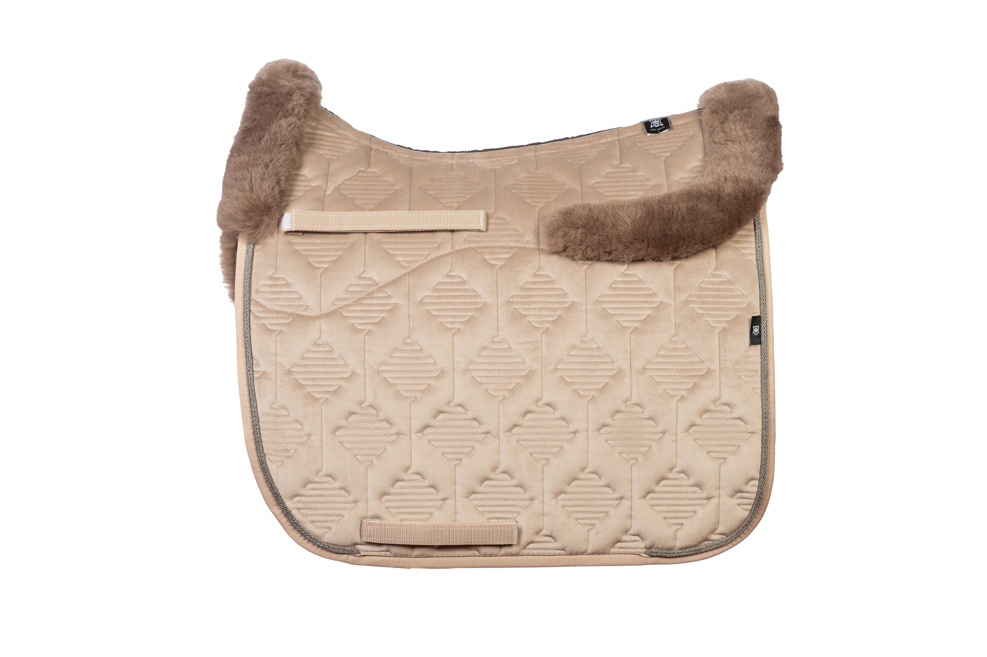 Mattes Schabracke, Dressur Gr. L, Walnuss/Cappucchino mit Webkordel und Lammfellrand vorne und hinten